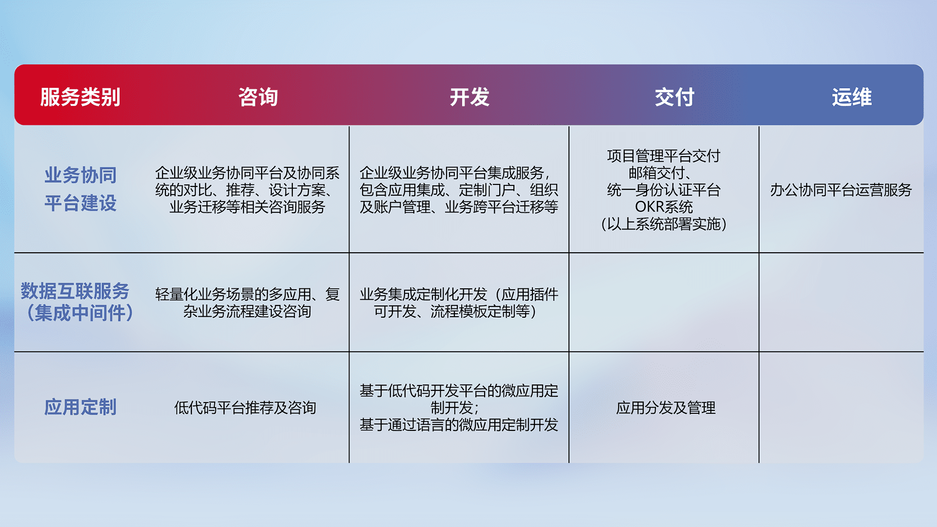 针对钉钉、、、企微、、、IDaas等平台级产品提供产品的规划、、、、方案、、、交付、、、定制化开发等服务,,,实现如统一协同办公、、智能客户服务、、、、混合会议管理、、、、智能数据查询、、、等业务场景,,实现数字化转型。。